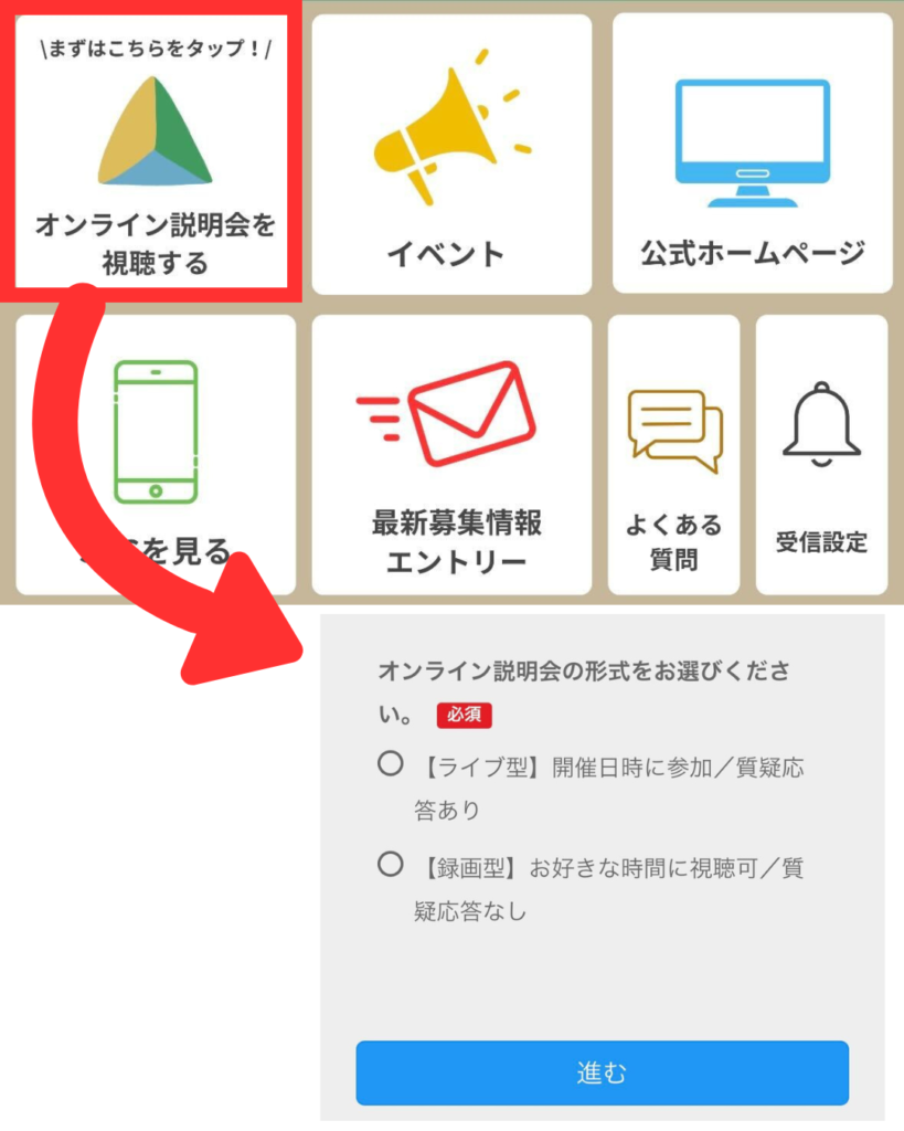 ③アンケート回答後に表示されるリッチメニューより、左上の「オンライン説明会を視聴する」をタップし、説明会の視聴形式を選択。